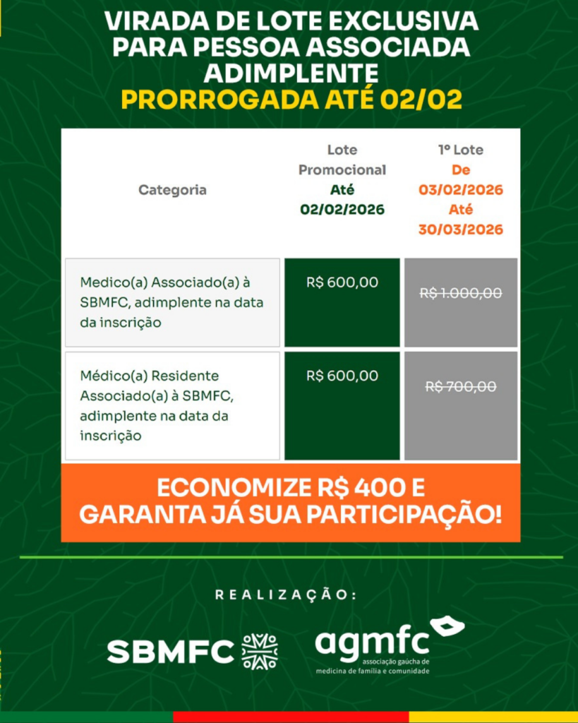 A virada de lote exclusivo do 19º CBMFC (Congresso Brasileiro de Medicina de Família e Comunidade) para pessoas adimplentes foi prorrogada até 02 de fevereiro.